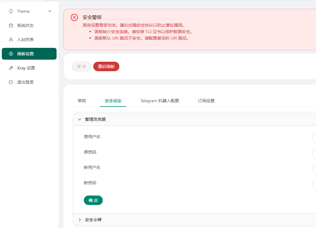 设置完毕以后,在1Panel面板里面重载配置,然后重新启动 Nginx,配置生效。至此,你可以使用 https://ip/X-UI/ 来访问你的 Xray 管理面板了后续注意:这样设置会使X-ui后台的二维码和分享链接无法直接使用,导入后必须手动服务器地址为你的域名或者IP,更改端口为443,开启TLS并填入你的域名及path。后续可以通过IP:54321/path 或 https://域名/path 访问X-ui后台,建议可以把54321端口用防火墙封禁掉只通过域名HTTPS访问,