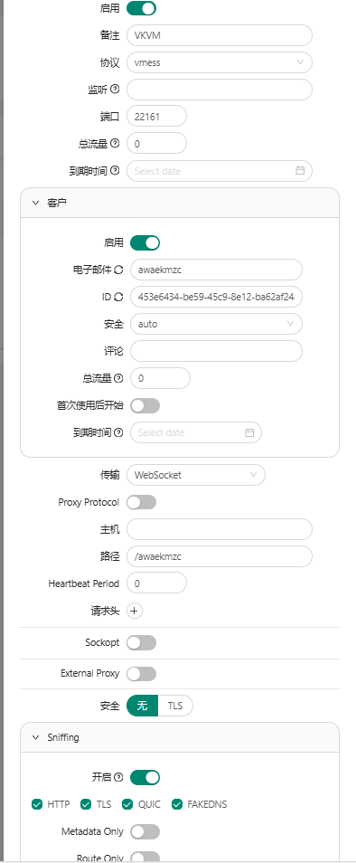 在3X-UI左侧选择 入站列表,选择 添加入站(其实就是新建节点的意思)。各设置项按如下设置: